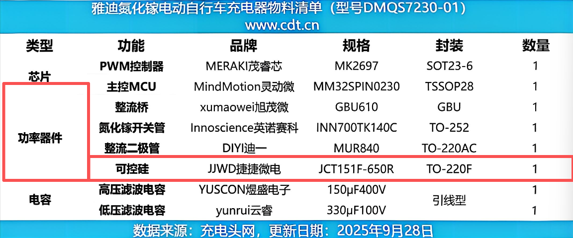 為何雅迪選擇JCT151F-650R? ? ? 高耐壓,更安全:650V的斷態(tài)重復(fù)峰值電壓,足以應(yīng)對充電過程中各種復(fù)雜的電壓波動與浪涌沖擊,為系統(tǒng)預(yù)留充足的電壓余量。 ? ? 大電流,更穩(wěn)定:12A的有效通態(tài)電流,確保在持續(xù)充電的大電流場景下,器件導(dǎo)通損耗低、發(fā)熱小,穩(wěn)定性與壽命顯著提升。 ? ? TO-220F全絕緣封裝:封裝本身具備良好的絕緣性與散熱性,無需額外絕緣墊片,簡化生產(chǎn)安裝流程,同時(shí)提升整機(jī)安全等級與散熱效率。 安全無小事,選對“守護(hù)芯” ? ? 雅迪充電器采用捷捷微電JCT151F-650R,體現(xiàn)了品牌對產(chǎn)品安全性的極致追求。在電動車充電器這類關(guān)乎用戶生命財(cái)產(chǎn)安全的產(chǎn)品中,核心保護(hù)元器件的選擇,直接決定了產(chǎn)品的安全基線。 ? ? 捷捷微電的功率半導(dǎo)體器件,已在家電、充電電源、工控及汽車電子等領(lǐng)域獲得廣泛應(yīng)用。公司始終致力于通過高可靠性、高一致性的產(chǎn)品,為行業(yè)領(lǐng)先客戶的關(guān)鍵設(shè)計(jì)與創(chuàng)新賦能。如果您對我們的產(chǎn)品感興趣,歡迎隨時(shí)聯(lián)系我們,也可登錄我們的官網(wǎng)m.a2324.cn進(jìn)一步了解。
